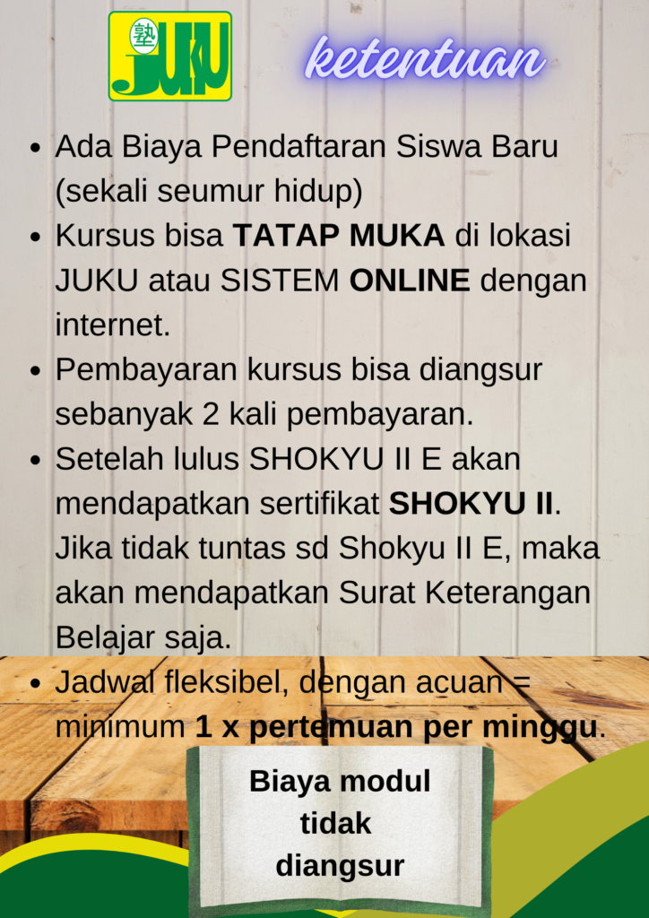 - Sudah mempelajari materi dasar Bahasa Jepang setara JLPT N5 atau sudah menyelesaikan materi Minna no Nihongo I.